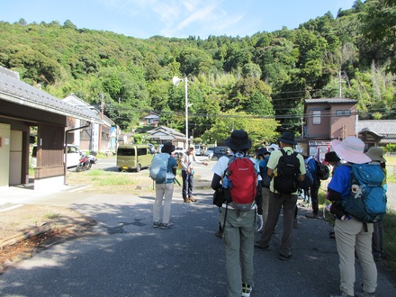 9:20長命寺バス停横の広場で、出発前のリーダー挨拶 |
