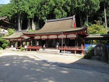 9:50長命寺の三仏堂、反対方向を向くと琵琶湖が木々の間から見えました。 |