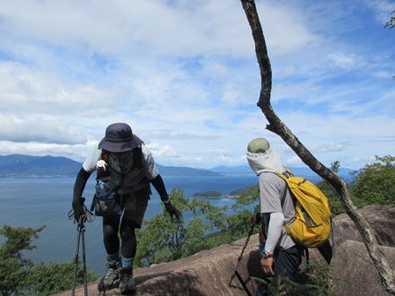 長命寺バス停でバスを降りると、目の前が琵琶湖である。そこにはサイクリストが多数集まっている。私たちは長命寺を目指すが、それには長い階段が待ち受けている。出発早々808段もの階段を登るには過酷すぎるので、横の林道を長命寺に向かう。約30分で到着し本日の登山の安全を祈願する。長命寺山頂は樹木が茂っていて全く展望がきかない。貧弱で僅かに山名が読めるだけの板があるだけです。奥島山手前に空奏テラスの標識があり行ってみると岩棚が張り出しそこに立つと遮る物が無く琵琶湖や向こうには比良連山が眺められる。180度展望のある絶景だ。打越峠からは林道を百々神社がある北津田集落まで下る。百々神社は長命寺川に架かる渡合橋に現れた大蛇を祀るという社だそうです。ここから鶴翼山(八幡山)まで登り直す。山頂まであちらこちらで琵琶湖が望められ、眺望の良いルートです。