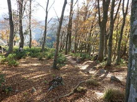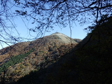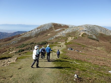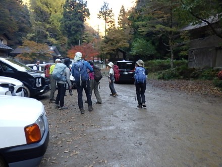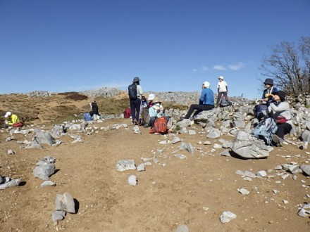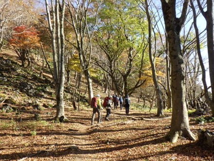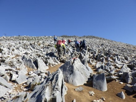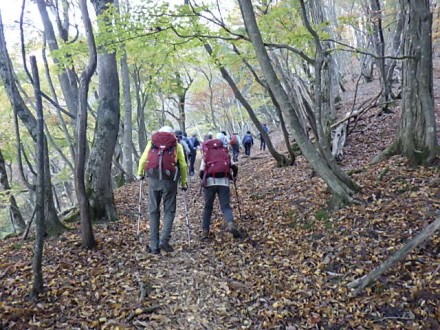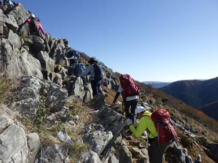 8:40タクシーにて彦根から今は廃村(霊前今畑集落1970年代末頃)になった村の入口にある今畑登山口着。ここで福井県敦賀市在住の村浪氏と合流。今回は泉州山岳会会員とEPE新入会員を含め9名の参加です。少し肌寒いが天気は上々。朽ちかけたお寺(宗金寺)や廃屋を横目に笹峠へ向け九十九道をゆっくり登る。 青空と木漏れ日の中、落ち葉が敷き詰められた紅葉の森を抜けると笹峠着。 峠からなだらかな紅葉の登山道を登ると、眼前に石灰岩地形(カレンフェルト)の白い石柱が林立したまるで剣山(けんざん)のような約300mの急斜面が立ちはだかる。登ること約1時間で頂上へと続く稜線上に出ると近江展望台である。展望台からは真っ青な空の下、カレンフェルトの稜線上を左に琵琶湖、そして右に紅葉と針葉樹林のコントラストが鮮やかな山並みの斜面を望みながら稜線上を頂上に向けて登り続ける。 11:40霊仙山最高峰着。遠くに比叡山、琵琶湖、比良山さらに白く輝く白山、南東には伊勢湾、そして北に目を向けると青春時代雪上訓練に明け暮れた伊吹山を望むことができた。 その後10分程稜線を歩くと霊仙山頂上着。 ぽかぽか陽気の頂上でくつろぎ、爽やかな風が吹く白いカレンフェルト地形の西南尾根を下り紅葉の森を抜け廃屋の家々の前をとおり、再度今畑登山口着。15:00に予約していたタクシーに乗り込み彦根に向かった。