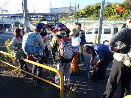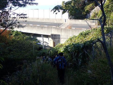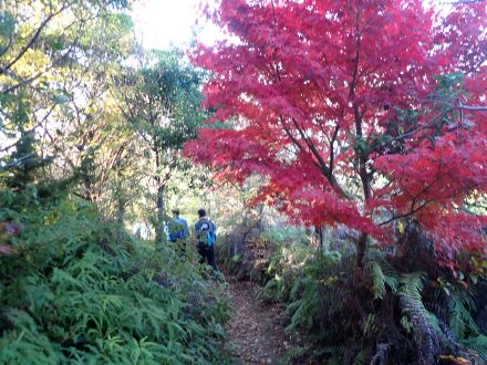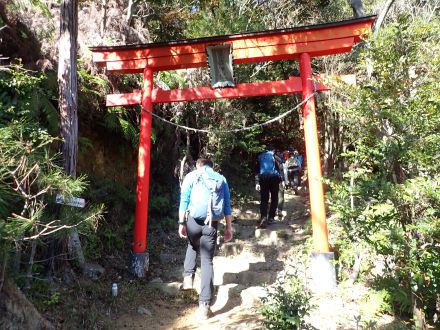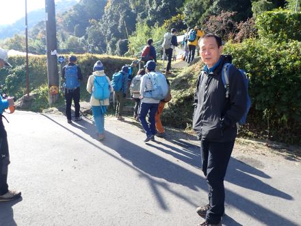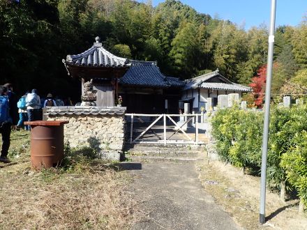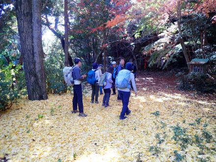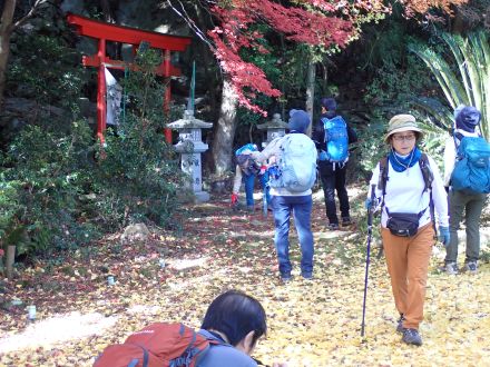 西谷寺からしばらくは小岩だらけで歩きにくい山道が続きます。信浄院の参道は石の階段になっており上がってみました。銀杏があり黄色の絨毯のような落葉が、なかなかのものだった。山頂からは、北に六甲山・西に淡路島が見えるはずのところ、残念ながら霞んではっきりしなかった。飯盛山登山口のバス時間の関係で下山コースをみさき公園駅に変え下山しました。 西谷寺からのコースはあまり人が入っていないような様子です。 パノラマを期待した例会でしたが、遠望に少々物足りなさを感じました。