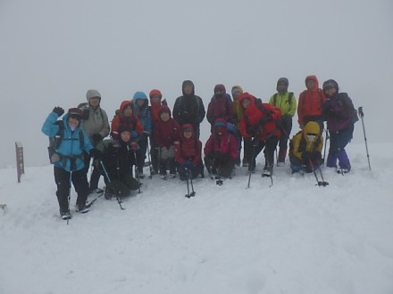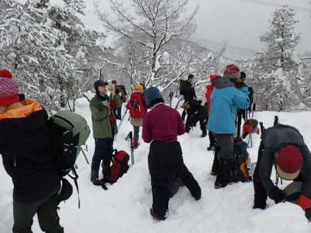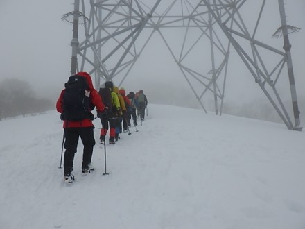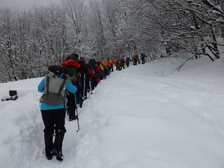 樹氷のメタセコイヤ並木を眺めながら9時前にマキノゲレンデ駐車場に到着しました。アイゼン以外は冬装備で9時出発、 積雪は130センチで絶好の冬山が楽しめそうです。登山口からは多くの登山者で踏み固められた道になっています。ほかのパーティーはほぼスノーシューです、ツボ足で問題ないのですがそれなりに追い抜かれたり追い越したりで10時40分武奈の木平の四阿で一休みしました。この付近までくると積雪は2メートル超になってきました。天候はまずまずで小雪がちらほら降っている程度です。粟柄越への途中に鉄塔がありこの付近からふぶいてきました。かすかに赤坂山を眺めると雪庇が出ていました。粟柄越から先は吹雪の中でホワイトアウトです、かき消されそうなトレースを辿り12時30分視界ゼロの頂上着。予定では寒風経由でラウンドして下山予定でしたが、このホワイトアウト状況では無理と判断し、写真を撮って早々に往路を下山することにしましたがトレースは風でかき消されています。慎重に進路を探して目標の鉄塔まで降りてきました。あとは尻セードではしゃいだり、踏み固められた急斜面を避けて深雪をラッセルしたり思い思いに下って15時ゲレンデに下山しました。たくさん参加していただき有難うございました。