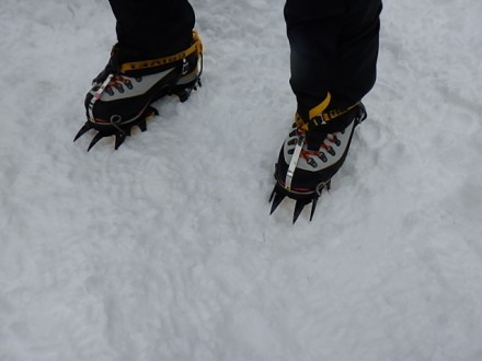 踏み固められた道で転ばないようアイゼンを付けています |