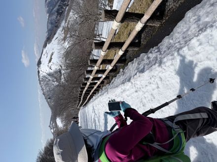 御在所と言えば、山岳会会員が何十年と通った岩場があります。ですが御在所の山頂には一度も登った事がないと言う会員もおられました。 今回は、その山頂をめざします。当初予定の小屋泊を変更して日帰りにしました。 車3台に分乗して天王寺を出発し、トイレを借りようとケーブル駅に着きましたが、ケーブル乗車の人で溢れていました。早々にトイレを済ましゲート前のPに何とか3台止める事が出来ました。 今日は、気温も20度近くになる予報でまさか雪なんか残っていないとたかをくくっていたのですが、歩き始めるとチラホラ雪が残っています。ですが気温が高いせいで道は凍っていないので順調に登っていけました。途中雪が多く残っている所からチェーンアイゼンを付けました。もし気温が氷点下になって道が凍ってしまったらとてもチェーンアイゼンでは行けなかったと思います。 頂上までの見晴らしの良いポカポカと陽の当たる気持ちの良いところで昼食休憩にしました。 頂上に着くとそこは家族連れや若い人たちで賑わっていました。最高峰に行こうとしたのですが手前のピークから最高峰のピークに行く道が途切れてしまい行けなくなりました。戻って再び行くのも面倒ということで祠のある手前のピークで我慢しました。 下山は、藤内小屋までは岩場多く気が抜けません。ウサギの耳近くでチェーンアイゼンを外し後はアイゼンなしで無事下山できました。 お陰で雪道歩きの良い練習になったと思います。