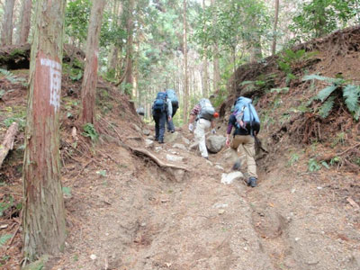 ![]() 布施城跡への尾根道に取付く、登山者は少ないようで道は荒れ気味 |