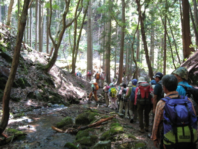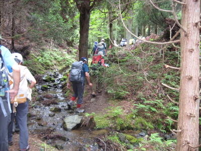 例年通りなら梅雨真っ只中のこの時期、雨具を着込んで歩くことになると思っていたが、意外にも真夏日を思わせる日差しの中を歩くことになった。でも、コースの大半は北山杉の林間で、沢沿いでは涼気に幾分か救われ、夏山のトレーニングとも思える一日でした。登山口から林道を進み、北山杉の林の中を寺谷峠へと登る。反対側に下って一ノ谷出合、穏やかなこの谷を詰めて雲取峠へ。ここからは稜線通しで雲取山頂上に着く。下りは二ノ谷にとり、二ノ谷出合からは先程の一ノ谷出合へと林道を経て登り返し、往路を辿って登山口へと戻る。稜線通しの上り下りとは違い今回のコースは、峠を越えてから目指す頂上に連なる稜線に至る谷を登り、頂上からは谷を下って再度峠を越えて戻ってくるというもので、北山の魅力とはこんなところにもあるのかな・・・との思いがしたのですが、参加の皆さんは如何だったでしょうか。 |