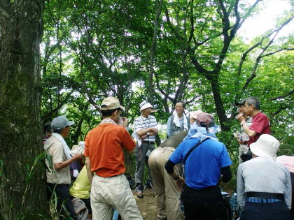 10:55 高安山(487,4m)の山頂 この地を中心に天智天皇(7世紀)により築かれた高安城について語る。古代の世情も決して安閑としたものではなかったようだ、今ほど気楽な世代はない。 |