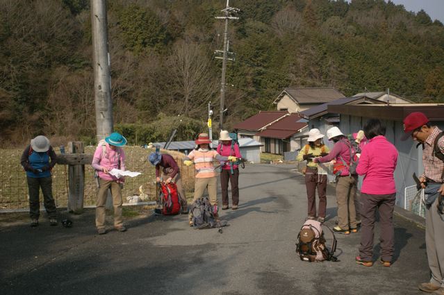 9:35 中日野バス停より少し歩いて登山口で天見駅迄の登山コースの説明と登山準備 |