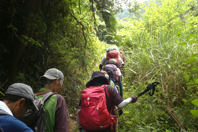 茶臼山のすそを通り稜線に出ようとしたが背丈ほどの草が茂り通行不能となり道まで下る。 |