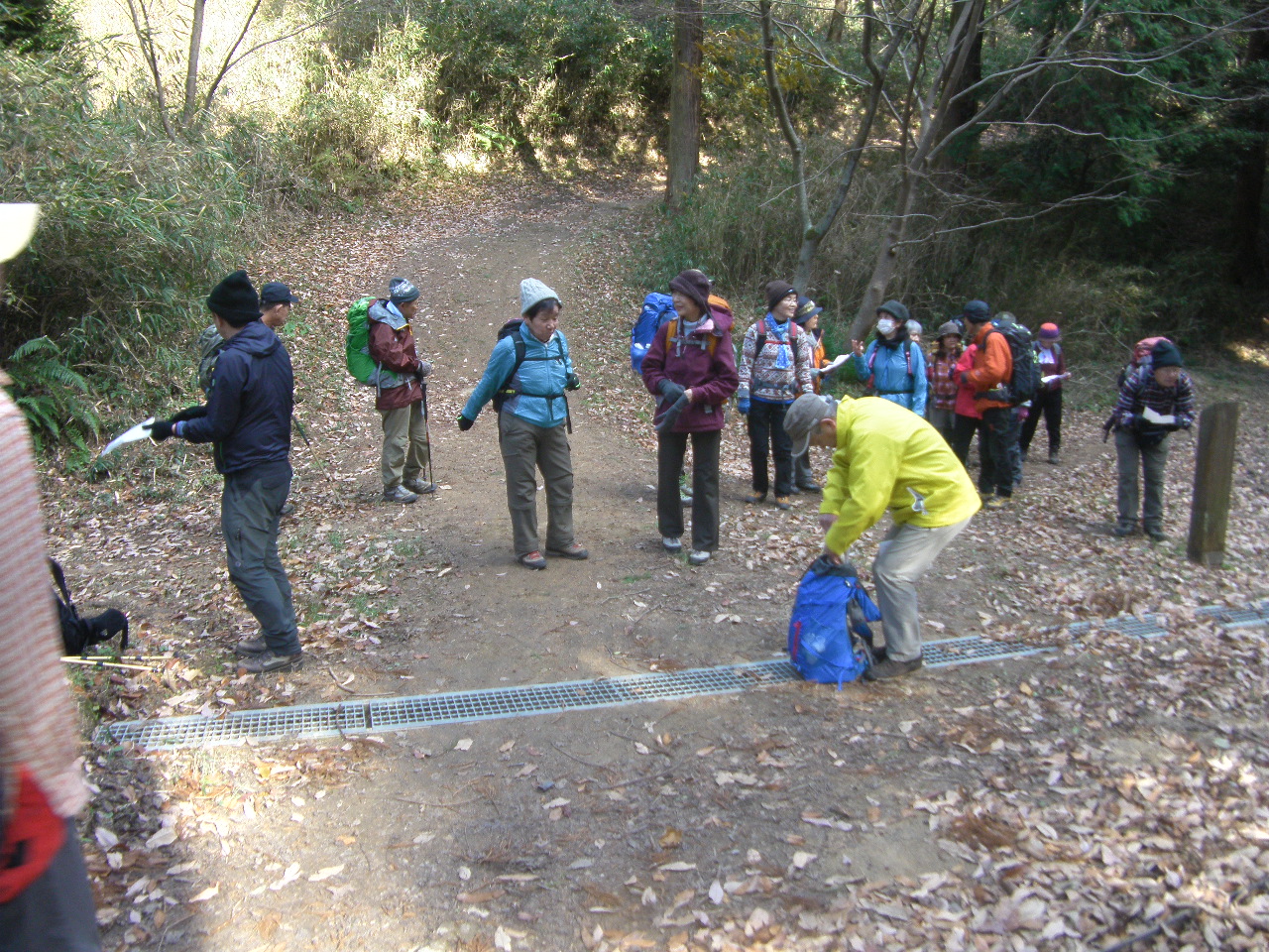 東生駒駅に降りると盆地特有の底冷えだが快晴の天気、集合時間になりぞろぞろとメンバーが降りてくると総勢21人の大所帯、少し多いなと思いながらも久々の大人数の例会、少しうれしく思いながら歩き始める。東生駒駅から少し歩き住宅地の間から東へ、ここを登ると矢田丘陵の縦走路になる。 縦走路は快適だが景色は望めない。単調な縦走路を30分程度歩くと椚峠に着く、交通量の多い県道を渡り帝塚山大学のキャンパスを東に見ながら歩いて行くと榁峠山 弘法大師堂に着く。石碑とお堂があるが休むところがないので先を急ぐ。 季節の忘れ物のような、たわわに実った柿木、雨量計測所を通り過ぎ小笹の辻の休憩所に着く。そこで休憩し松尾山へ 途中、国見台の展望台で昼食を取り松尾山に向かう。 松尾山の三角点は送信所の裏手にあり少し分り辛い、松尾山を下山後 松尾寺を経由し椿井城跡へ。椿井春日神社で歴探恒例の講和、嶋左近の話をし、大手門から登城する。やはり上がれば解る立地条件 王寺から平群までの展望、城を築くのも納得する。 椿井城跡から竜田川駅へ向かい竜田川駅で解散する。歴探といえども良く歩きました皆さんお疲れ様 |