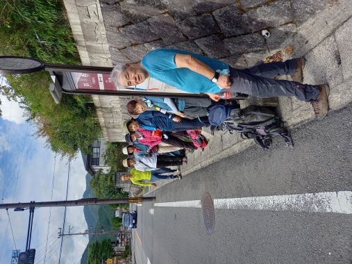9:25 大原のバス停でリーダーより挨拶 |