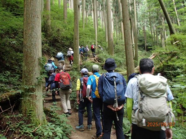 大阪の夏は暑い、 涼しさを求めて谷沿いの山道より登り始めました、水の流れを聞きながら少し登った所で小休憩、谷筋の登山道は少し涼しさを感じます。夏の登山は水分を補給をして熱中症対策が必要です。 山頂広場の標高は1,100m涼しさを感じながら昼食後は久留野峠まで、冷気を含んだ涼しい風が身体を通り過ぎて行きました、秋はもうそこまで来ています。 |