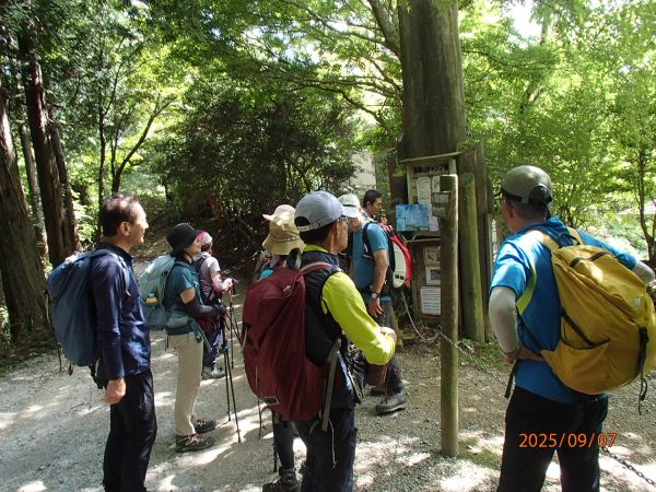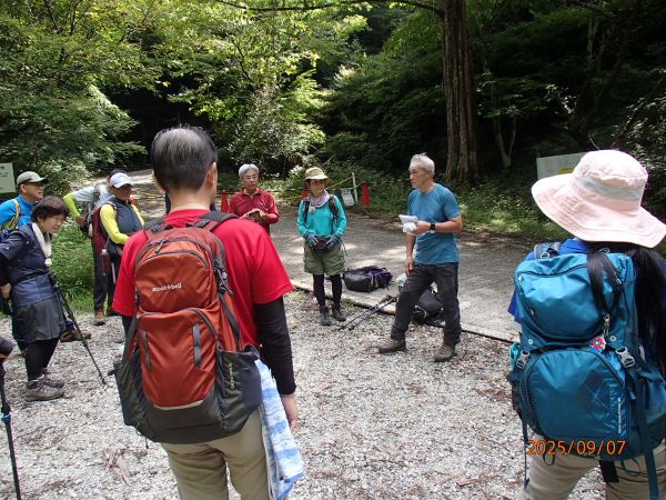 登山口のバス停でリーダーより出発前の挨拶 |