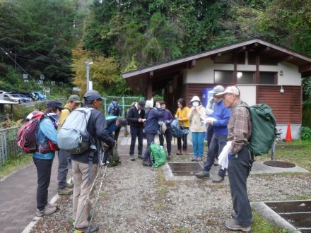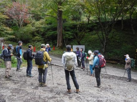 8:48金剛山伏見峠口バス停前でリーダーより出発の挨拶とコースの説明 |