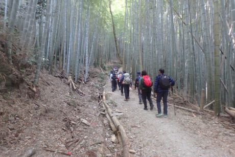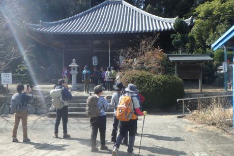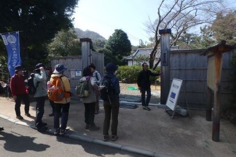 JR海南駅に集合。体験参加の人の自己紹介を受け10:40出発。あったかい日差し中、最初の祓戸王子へ。熊野古道の王子とは道中の安全祈願をする所で信仰の拠点であったと云われています。祓戸王子跡は熊野古道より少し外れた所にあり、たくさんの石仏が並んだ山道を10~15分登る。藪の中に寂しそうに祓戸王子跡の石碑が立っていた。もとの熊野古道に戻り、全国の鈴木姓の惣領とされている鈴木宅前を過ぎ藤白神社へ。南方熊楠ゆかりの大楠を見る。誠に大きな楠で何か霊的なものさえ感じる。ここには大楠が5本あるとの事。 「古来より生まれた子に、楠、藤、熊の名をつけると長命し出世すると言われ・・・世界的博物学者として高名な南方熊楠翁もその一人 」と藤白神社境内案内に書かれている。 本来窓越しでしか見れない三体の座像をボランテァの方の好意で目の前で見る事が出来た。およそ千年前の仏像との事であった。ここでランチタイムとする。 案内板に従って有馬皇子の墓へ。果樹園を過ぎ竹林の山道に入っていく。もっとも熊野古道らしさを残している所である。時代劇に出てくるような「すげ笠のふちに布を垂らした高貴な女性」が現れても、ちっとも不思議ではない。筆捨松、硯石をすぎ藤白塔下王子跡で休憩。ここから熊野古道第一の美景と云われている御所の芝へ。御所の芝からは海南の工業地帯と雑賀崎の海岸と思われる景観が見て取れる。工業地帯が少々興ざめだが近代化がされていない昔であれば、きっと素晴らしいものだったに違いない。ジグダクに下って冷水浦駅14:25着。誰もいない無人駅で解散としました。