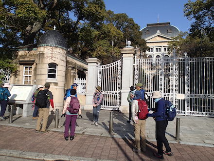 8:35 1902年に建てられた兵庫県公館前でリーダーより挨拶 |