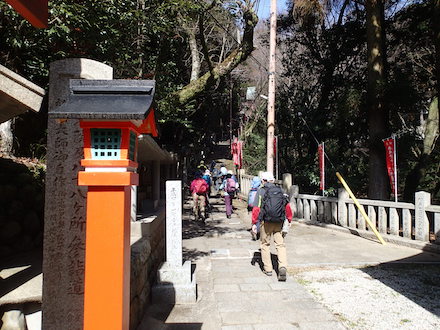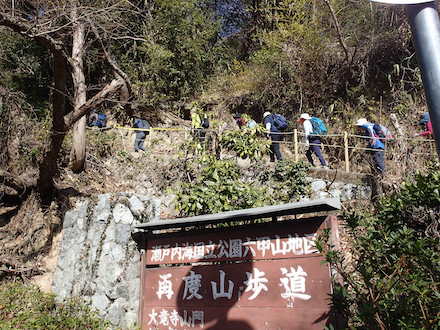 今回の例会は、JR神戸線や瀬戸内海のフェリーから見た神戸の夜景で他の都市 では見かけることの無い神戸市のシンボルマーク錨山、市章山をメインとして計画、その延 長線上に再度山をくっ付けました。 コースはJR元町駅から諏訪神社に向かい、長い石段を上って社殿の前を右折、遊歩道を辿ってビーナスブリッジの展望台へ。ひと昔前までは展望台の手すりには、永遠の恋を誓った恋人たちの掛けた数百個の南京錠で溢れていたらしい。現在は洒落た専用のモニュメントが設置されているが、そのような遊び心が廃れたのか今日掛かっていたのは10数個だけ。寂しい限りだが眼下に広がる展望は文句なしの一級品です。 ビーナスブリッジから一旦車道に下りて諏訪山、錨山、市章山へ向かう。三角点はないが神戸市街はもとより、遠くアベノハルカス等も見渡せる絶景が広がっていました。市章山からは車道を少々歩き堂徳山へ。堂徳山からは二本松を経て車道沿いの斜面に引かれた登山道をしばらく歩いていると「毎日登山発祥の碑」に到着する。その昔ここには「善助茶屋」というのがあって、最盛時には百冊を超える登山者名簿が置かれ大層賑わっていたそうですが第二次大戦後は訪れる人も減少し小屋は荒廃、取り壊されたとのこと。碑の横には四阿(東屋)が有り、この四阿を囲む木々をリスが駆け回りメンバー全員大騒ぎ。梅の木には花も咲いていました。西村さんによると駆け回っていたリスは「台湾リス」とのことです。 毎日登山の碑から数分歩くと大龍寺本殿に続く長い石段があります。石段を登り切った本殿でお参りの後、再度山(ふたたびさん)頂上へ向かう。「再度山」の地名は弘法大師が唐での修行を終えて帰国後、再びこの地を訪れたことから名付けられたということです。 再度山頂上での昼食後、再度越まで下降。ここからは過去10数回通った六甲全山縦走路を辿って大龍寺山門から市ケ原へ。私にとって「六甲全縦」は体力測定の意味もあって多い年は2回やっていました。市ケ原で小休止後、布引貯水池を経て名勝「布引の滝」前の展望台で「この滝を登るなら左の岩を・・」等の滝談義の花が咲く。その後、新神戸駅で解散しました。今日は天気も良く上々の登山日和でした。 |
