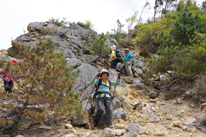 2013年12月の例会で仙ヶ岳~宮指路岳への縦走に挑戦したが、意外な積雪量に阻まれて完遂できなかった。そのリベンジも兼ね今回は入道ヶ岳からの逆回りで宮指路岳を巡るコースで計画した。8時間を超える長丁場でしたが、皆さんがんばって予定どおりのコースを完歩できました。鎌ヶ岳以南の縦走路やそれにつながる尾根は鎌尾根に代表されるように、岩稜や風化した花崗岩の崩壊地となっている個所が多く、今回のコースもそうだが、アルペン的な雰囲気と適度なスリルも味わえ退屈しないルートが多い。おまけにこの季節であれば、花も期待できる。入道ヶ岳と宮指路岳周辺で人と出会っただけで、我々のようなロングコースを辿る人はまれなので、連休中とはいえ、静かな山行ができました。 |