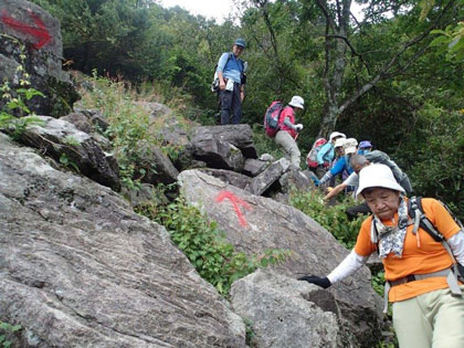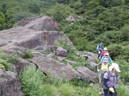 16:00 往路を戻り、冠岳からツツジが原コースを下る。ロープが張られた岩場が次々と現れる。 |