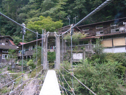 平等嵓を見上げながら吊橋を渡る、ここまで来れば今夜の宿、桃ノ木山の家は近い |