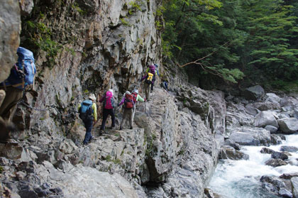 山の家から堂倉谷出合いまでが核心部と言える、クサリはあるがきわどいコースを辿る |