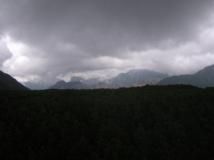 小屋前からハイ松越しに硫黄尾根と北鎌尾根を望むが槍は雲の中です |