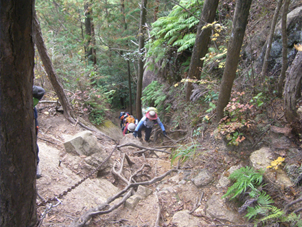 その名の通り三つの岩山を持つ三倉岳、三番目のピーク夕陽岳を目指し、再び鎖場を登る |