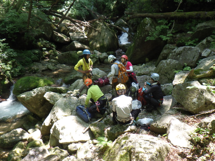 梅雨の晴れ間を期待して久しぶりの沢登りに12名そろいました、マイカーに分乗して一路ガリバー旅行村を目指し、9時前にガリバー旅行村駐車場着、挨拶を済ませ、入渓箇所までは近いのでここで沢装束を装着してスタートしました。10時前入渓点の魚止の滝下着、ここで小休止、沢に入って天気は曇っていますが水の冷たさは感じませんでした、魚止の滝は左岸を水に濡れないように登ります、すぐ横に登山道が有りますができるだけ沢芯を歩き障子の滝下へ、滝のしぶきが心地よく感じられます、ここは右岸の壁に鎖があり登りやすそうですが濡れていて滑りそうです、念のためロープを出して一人ずつ10mほどの壁を登って右岸の巻き道へ出ました、ちょっとスリルのあるところです。しばらく遊歩道を行き、鎖を頼りにいったん沢に降りて左岸へ渡渉します。はしごや鎖をつかんで登ると、本日最大の滝貴船の滝が見られました。ゴルジュ状のところをへつったり、水の中を行ったり、変化に富んだコースです、 13時ころ七遍返しの手前で遡行を終了し、遊歩道で駐車場に戻りました、途中からは天気も良くなり、皆さんも久しぶりの沢登が楽しめたようでした。 |