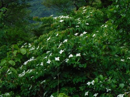 7月3日 雨が降らないうちにと思い4時起床5時出発を目標にしていたがなんやかんやと時間がかかり 5時半過ぎに出発となった。テント場から頂上まで1200mの登りだ。天気を心配しながら 樹林帯を登っていくが暑いし風もない、汗をかきながら六本檜に着き鳩が湯新道を三の峰に向かって進む。六本檜からは南に野伏ヶ岳、願教寺山 西に赤兎山が見える。展望はよい 剣ヶ岩に差し掛かるころ雷鳴が聞こえた。嫌な予感をしながら剣ヶ岩で雨具をだす。 尾根道にはニッコウキスゲ、シナノキンバイ、タカネバラ、等が咲いていて疲れも癒してくれる。冷たい雨の中、最後の急登を登りきると霧の中に三の峰避難小屋が見えてきた。 中に入ると20人~30人の登山者で一杯になっており立休憩を余儀なくされた。 少し休んで頂上に行くがガスで何も見えない。 下山道から小屋付近を見ると大きな雪渓がある。寒いわけだ、小屋に入り少し休憩後下山する。 下山途中に霧も取れ登って来た道が雲の合間から見えてきた雄大な景色に感激をする。 六本檜に差し掛かると雨も小雨になりだらだらと続く下山道を黙々と歩き林道に着くと雨も上がりテント場に向かって歩く。途中温泉に寄り解散し帰阪の途に就きました |