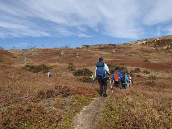 11月19日先日からの天気予報では日曜日は雨の予報、土曜日は晴れ時々曇りなので急きょ、長い工程になると思い日曜日に予定していたテーブルランドを土曜日に変更。移動時間が長いため薄暗い中での下山になるかなと心配しつつ車を走らせ駐車場に着くともう20台ぐらいの車が止まっていました。早々に挨拶を済ませ駐車場から林道を歩き登山口へ。登山口からP878まで急登が続くP878から尾根へ出ると小さなアップダウンが続く、樹林の合間から見えてくるボタンブチは迫力がありました。しばらく歩き台地の直下に差し掛かり最後の急登を登り切るとテーブルランドへ出る。台地を周遊しボタンブチから奥の平P1194を通過し台地の南端の下山口へと向かう。下山口から見ると転げ落ちそうな急斜面を下降し土倉岳へと向かう。尾根道をしばらく歩きノタノ坂から林道に出、駐車場へと向かった。思ったより早く下山でき、明るいうちに泊地のキャンプ場に向うことができました。 |