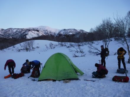 18日 朝から雨模様の中、出発する。昼からは上がっていくとの天気予報。白山中居神社に12時に着く予定なので昼までには雨が止むだろうと思いながら車を走らせる。標高の高いところでは山は雪模様とのことなので、心配していたが雪の影響も無く予定通り目的地白山中居神社の駐車場に着く。駐車場に入ると西野君が先着していて笑顔で迎えてくれた。積もる話もあるが時間もないので急いで支度をし、出発する。雪のつづら折りの林道歩きは踏み抜くことが多く歩きづらい。途中ショートカットで尾根道に入るがこの時期の山道は踏み抜くことが多く足元を気にしながら歩き泊地和田牧場に到着する。 早々にテントを張り夕食を食べ就寝する。 |