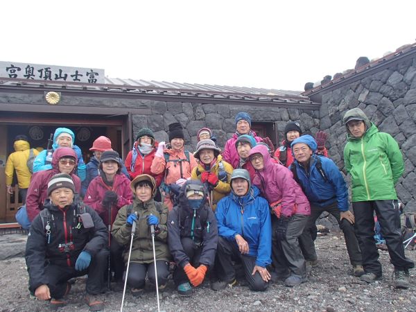 7/15(土) 真夜中午前0時起床、小屋は出発する客で大混雑。午前0時40分頃御来光山荘出発。小屋を出ると強風が吹きつけていました。元祖七合目・山口山荘でメンバーの1人が体調を崩す。小屋に少しの時間でもいいから休ませてくれないか交渉するも巌として受け付けない。仕方なく山倉リーダーの付き添いで下山。担当リーダーとしても残念でしたが、本人が最も残念だったと思います。元祖七合目・山口山荘上部から本格的にジグザク道が始まり、八合目・池田館を経て九合目・万年雪山荘到着。富士宮ルートで初めて、この時間帯にも利用できる食堂がありコーヒーやお汁粉等を飲みほっとできました。九合目・万年雪山荘から九合五勺・胸突山荘を経て、頂上直下の白い鳥居をくぐって富士宮口頂上、本宮浅間大社奥宮到着。奥宮を参拝したり、郵便局に立ち寄ったり、全員で登頂写真を撮ったりと思い思いに過ごしました。その後、強風の中を富士山頂剣ヶ峰に向かう。登山ルート毎に登り切った地点を山頂と名乗ってはいますが、やはり、この剣ヶ峰(3,776m)こそが正真正銘の富士山頂、日本最高地点、日本のてっぺんです。この剣ヶ峰で奥宮に戻るグループとお鉢巡りグループに分かれる。奥宮に戻るグループには森本リーダーがついてくれました。お鉢巡りは強風ではあったが順調に吉田口頂上の売店が並ぶ場所を通過。朝日岳手前の荒巻(火口から吹き上げる風の通り道)で猛烈な暴風に会う。吹き飛ばされないように風よけの石垣を必死に掴みながら突破。荒巻を通過後は特段の困難はなくスタート地点の奥宮に到着、売店で休憩後下山開始。富士宮ルートは往路がそのまま下山路になる。今日は真夜中にスタートしただけに、休憩を多く取ってはいるがメンバーの疲れもピーク。ゆっくり、慎重に下山を開始する。途中、メンバーの1人が体調不良を訴え、元祖七合目・山口山荘で休憩。森本リーダーとメンバー1人が付き添うことになった。新七合目・御来光山荘で預けてあった荷物を受け取り五合目に向けて下山を再開し、富士宮口五合目に全員集結後観光バスで旅館に向かいました。宿泊した旅館は富士山の展望が最大の売りになっており、最上階の大浴場から見た富士山は見事の一言でした。7/15(土)の富士山頂気象(気象庁調べ)最高気温7.1℃ 最低気温1.5℃ 風速20~26m/s(荒巻ではこの数値は超えていたと思われます) |