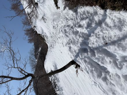 御在所と言えば、山岳会会員が何十年と通った岩場があります。ですが御在所の山頂には一度も登った事がないと言う会員もおられました。 今回は、その山頂をめざします。当初予定の小屋泊を変更して日帰りにしました。 車3台に分乗して天王寺を出発し、トイレを借りようとケーブル駅に着きましたが、ケーブル乗車の人で溢れていました。早々にトイレを済ましゲート前のPに何とか3台止める事が出来ました。 今日は、気温も20度近くになる予報でまさか雪なんか残っていないとたかをくくっていたのですが、歩き始めるとチラホラ雪が残っています。ですが気温が高いせいで道は凍っていないので順調に登っていけました。途中雪が多く残っている所からチェーンアイゼンを付けました。もし気温が氷点下になって道が凍ってしまったらとてもチェーンアイゼンでは行けなかったと思います。 頂上までの見晴らしの良いポカポカと陽の当たる気持ちの良いところで昼食休憩にしました。 頂上に着くとそこは家族連れや若い人たちで賑わっていました。最高峰に行こうとしたのですが手前のピークから最高峰のピークに行く道が途切れてしまい行けなくなりました。戻って再び行くのも面倒ということで祠のある手前のピークで我慢しました。 下山は、藤内小屋までは岩場多く気が抜けません。ウサギの耳近くでチェーンアイゼンを外し後はアイゼンなしで無事下山できました。 お陰で雪道歩きの良い練習になったと思います。